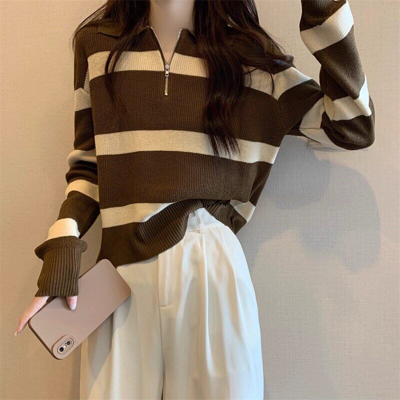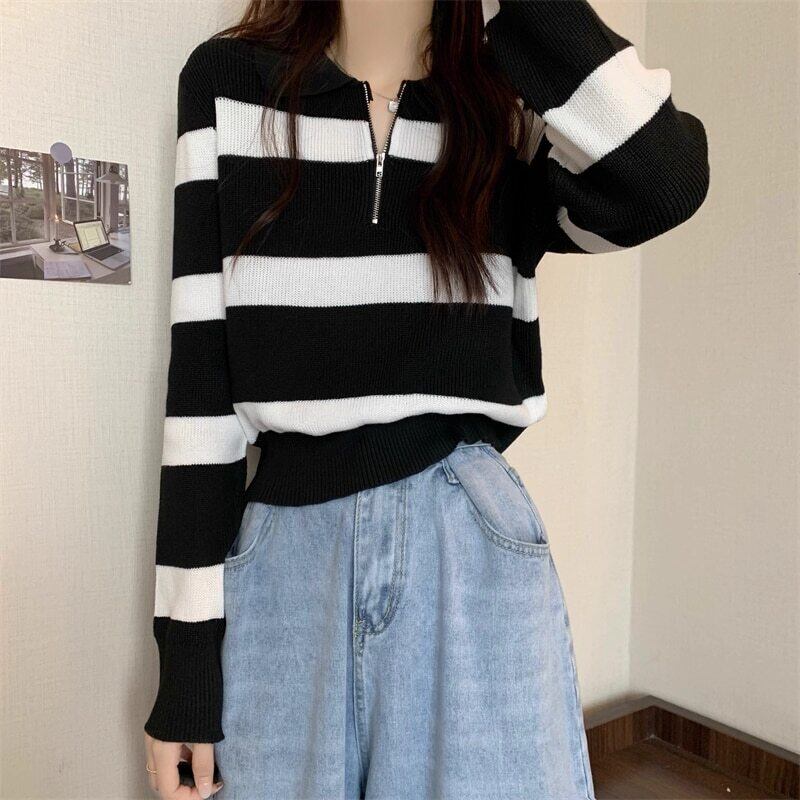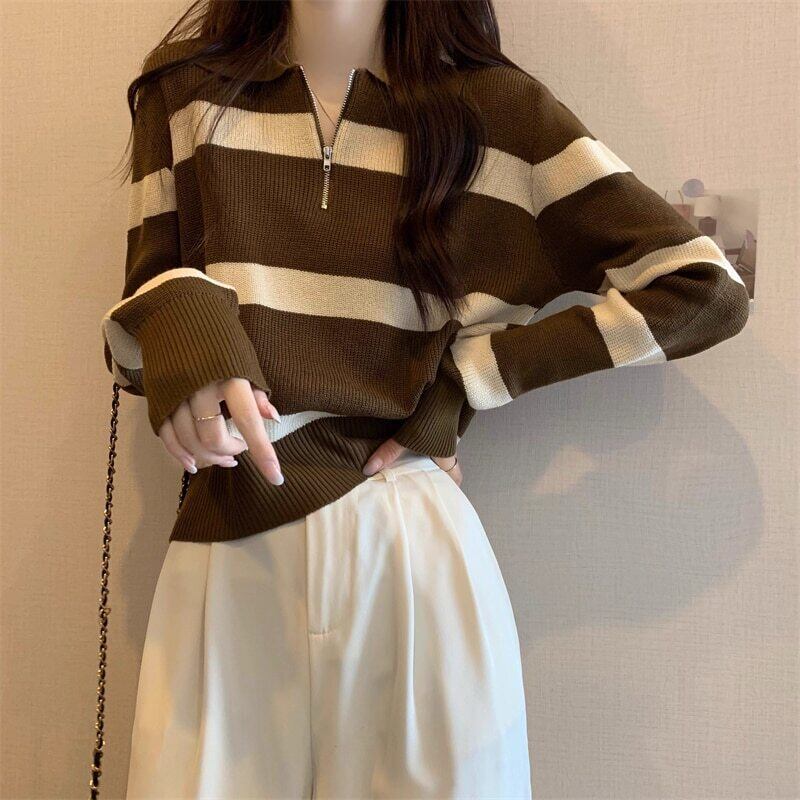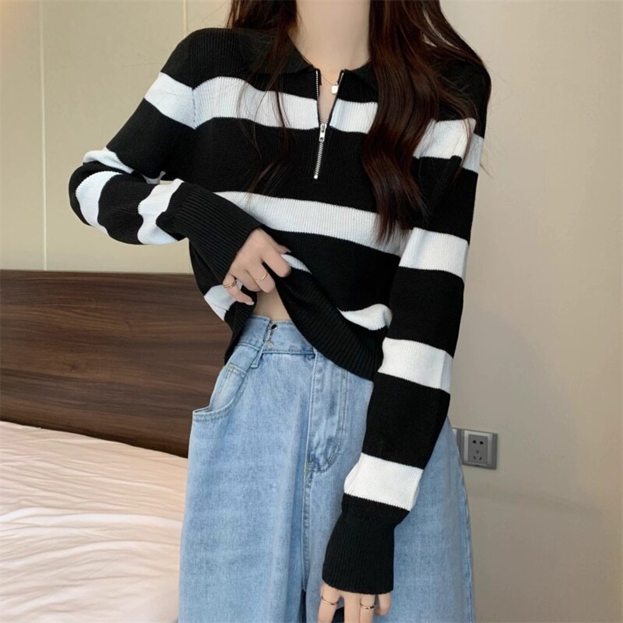 ハーフジップ ボーダー 襟付きニット