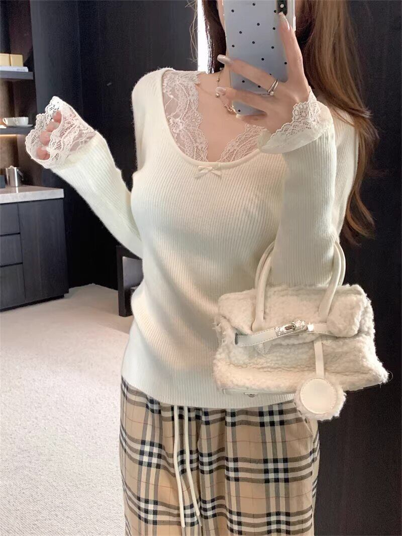Vネックフラワーレースリブニット