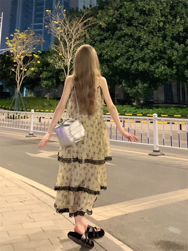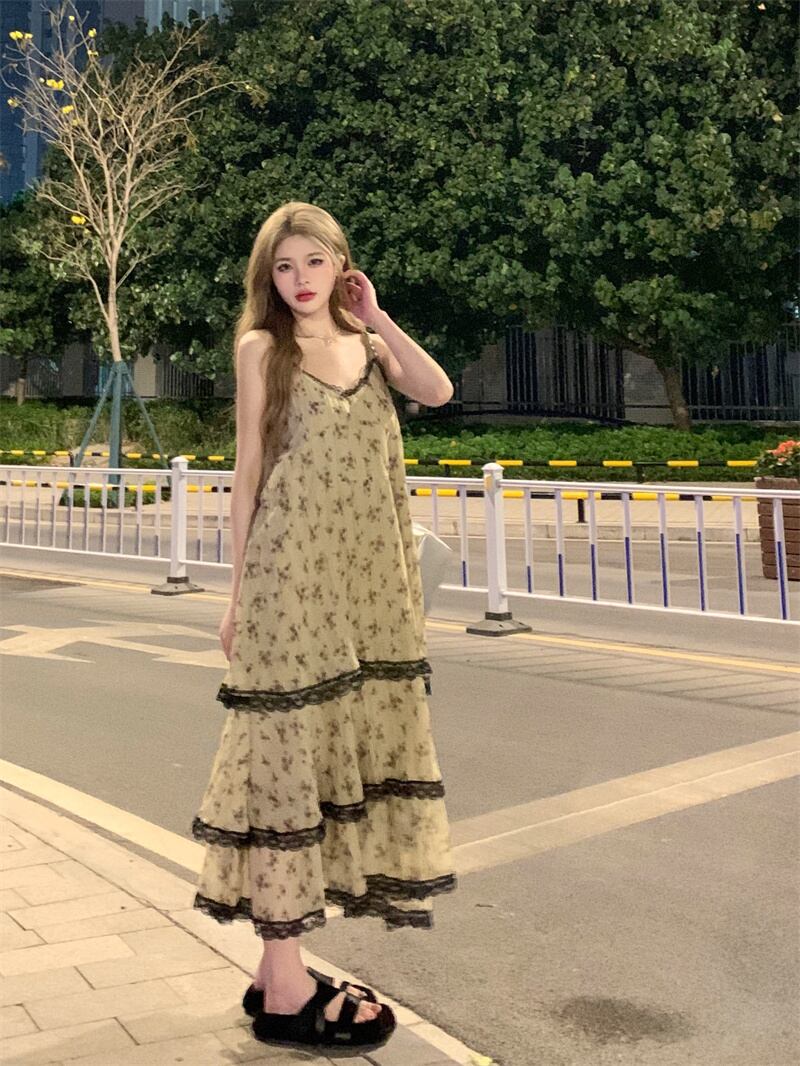 Vネック フレンチフローラル レースデザイン シフォン ワンピース