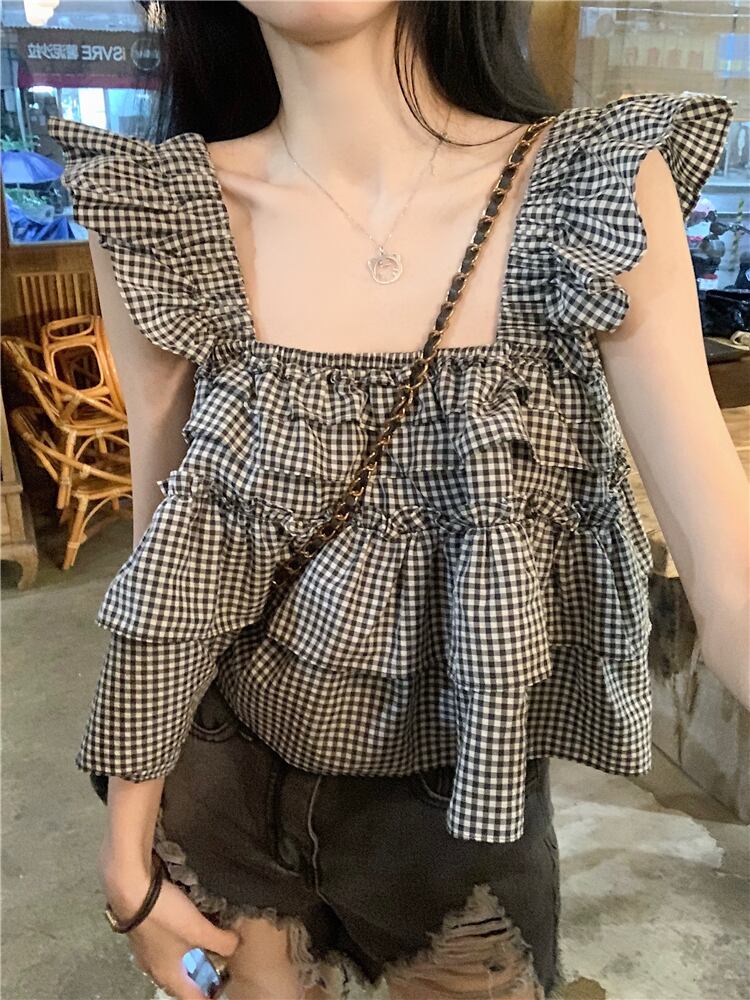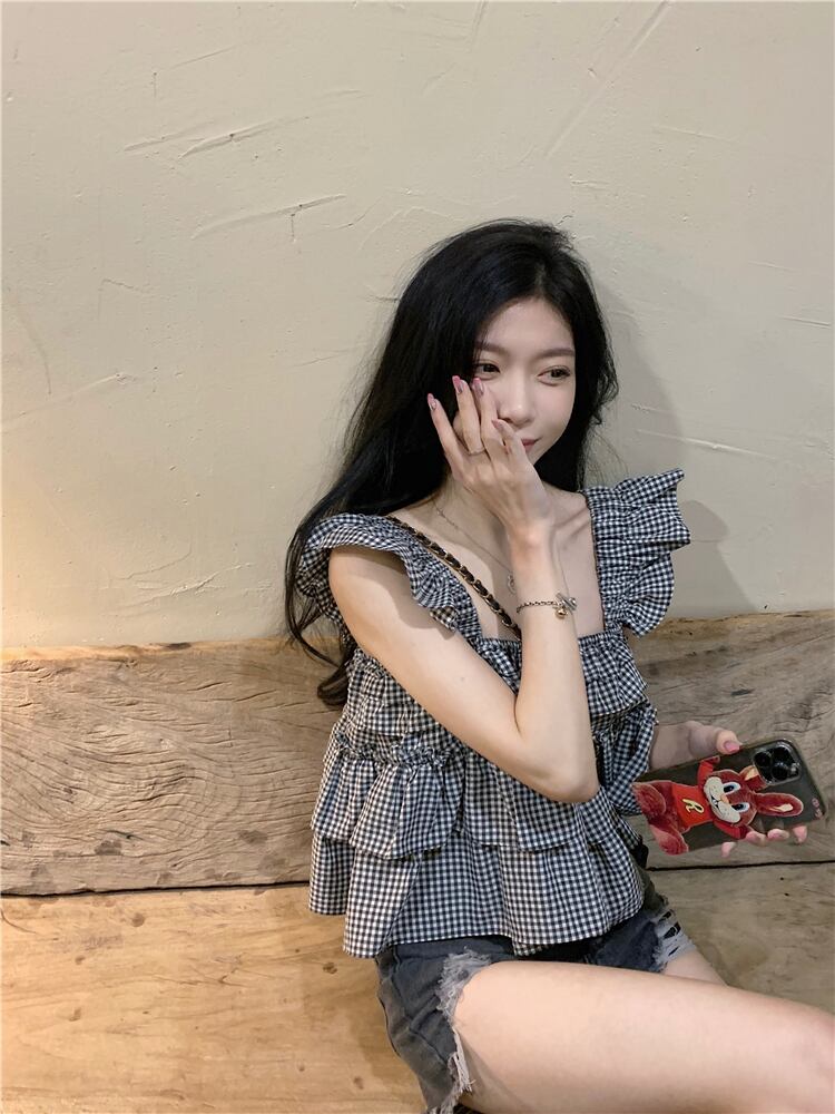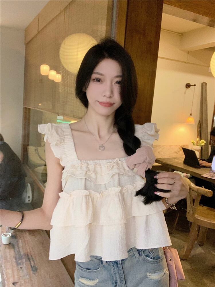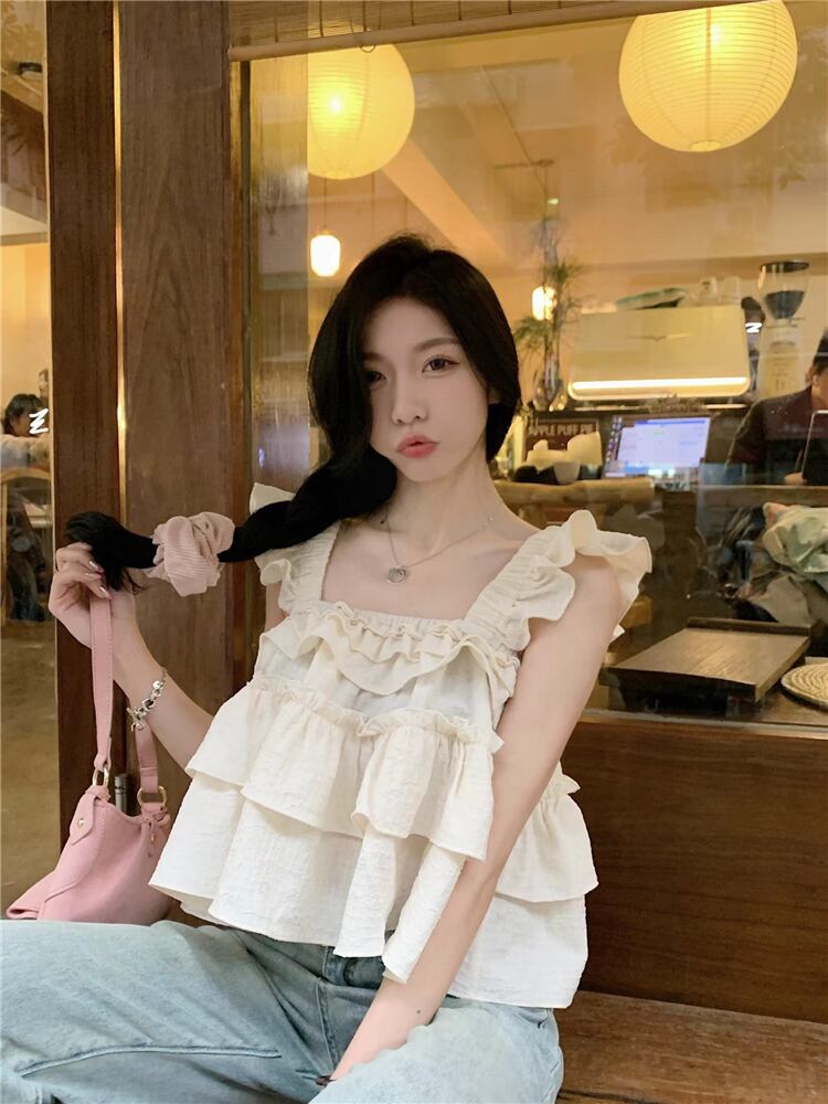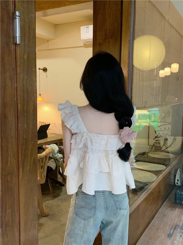 上品なフリルが襟元から肩にかけてたっぷりとあしらわれ、ふんわりとした印象に仕上がっています。袖口もフリルデザインで、手首まわりがスッキリと見えるのも魅力的です。