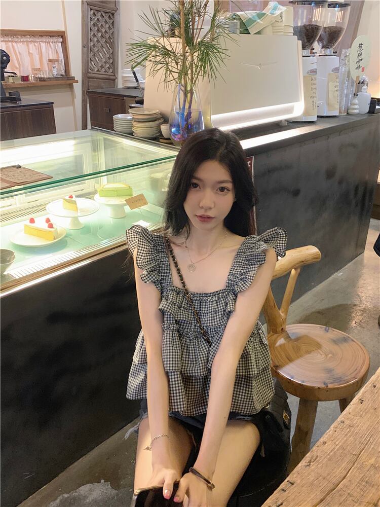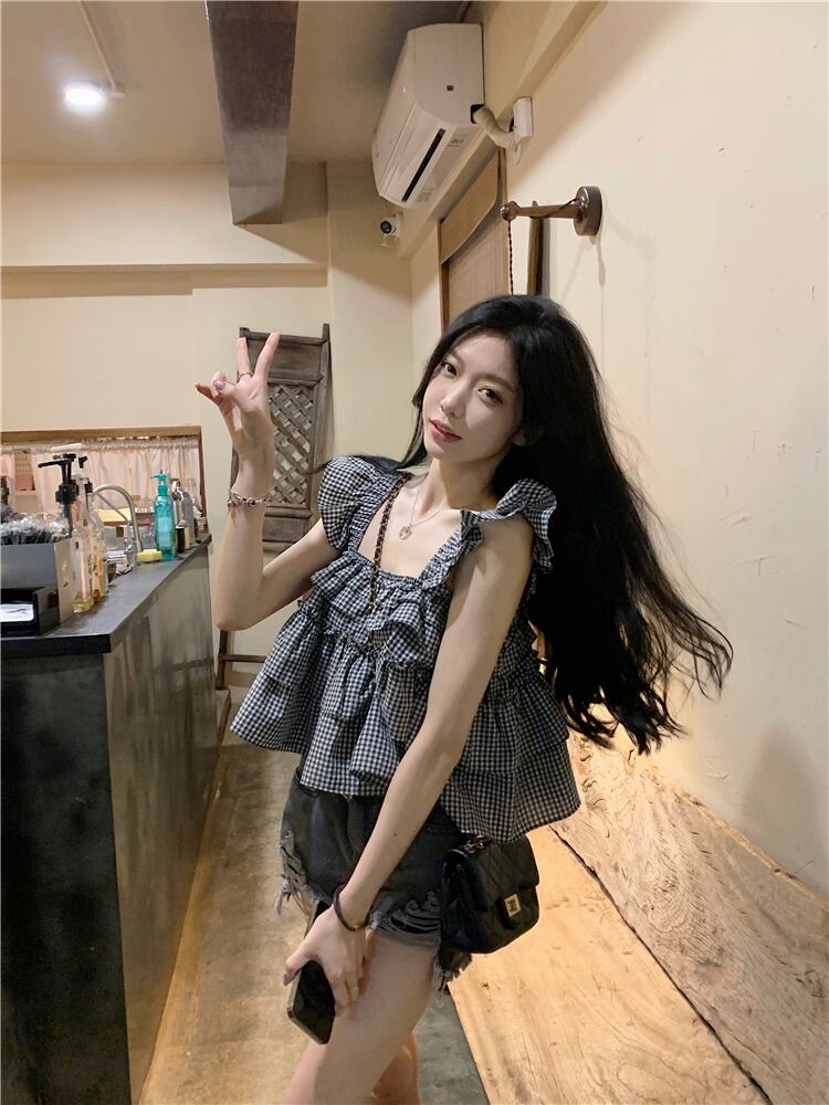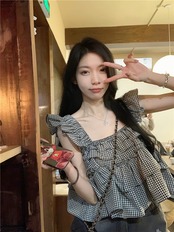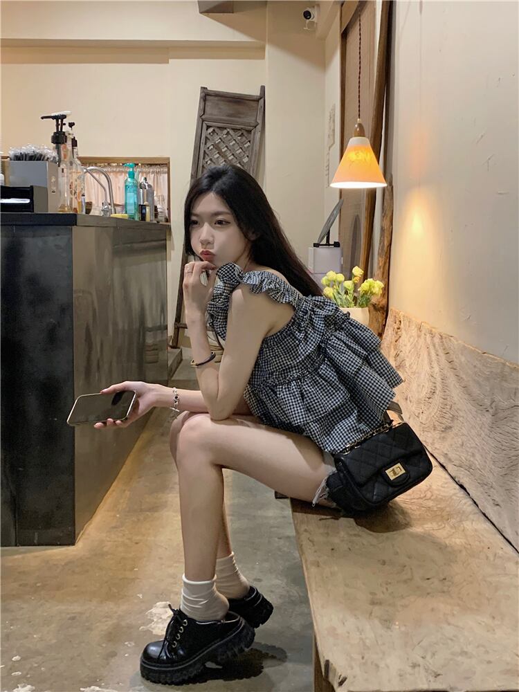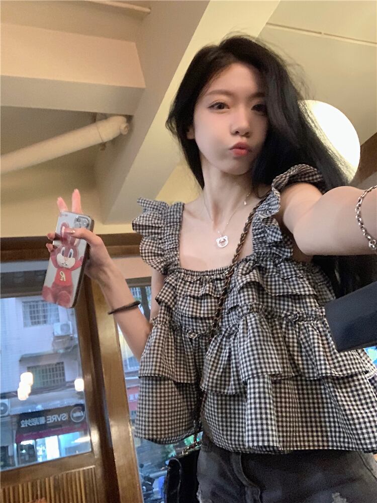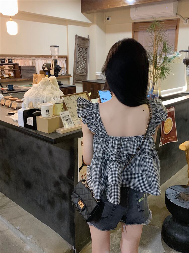 上品なフリルが襟元から肩にかけてたっぷりとあしらわれ、ふんわりとした印象に仕上がっています。袖口もフリルデザインで、手首まわりがスッキリと見えるのも魅力的です。