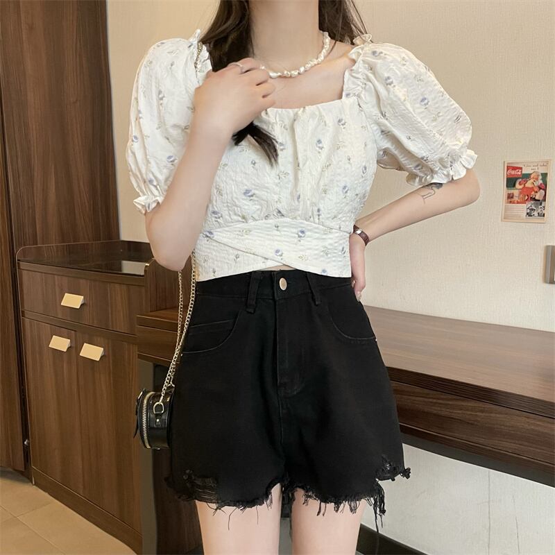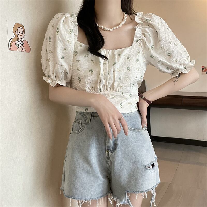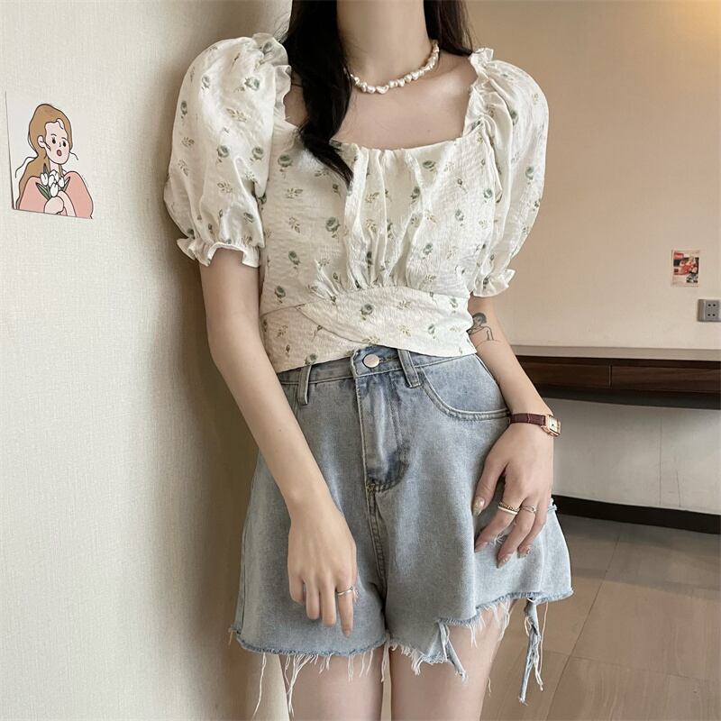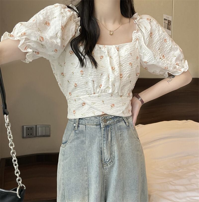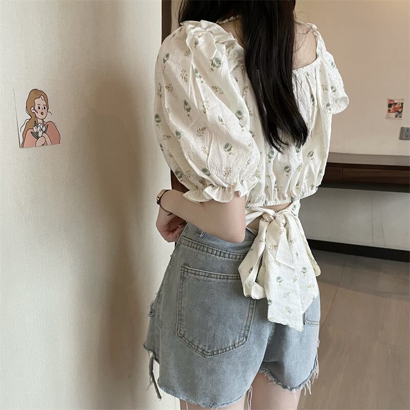 華やかな花柄プリントと女性らしいパフスリーブが特徴のショート丈シャツです。背中のリボンがアクセントになって、後ろ姿も可愛らしく演出してくれます。