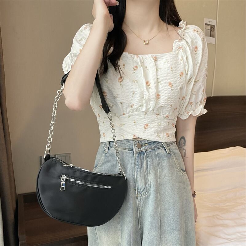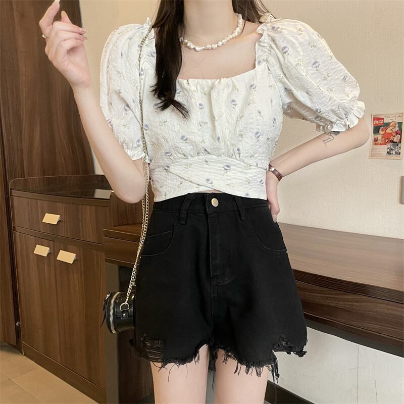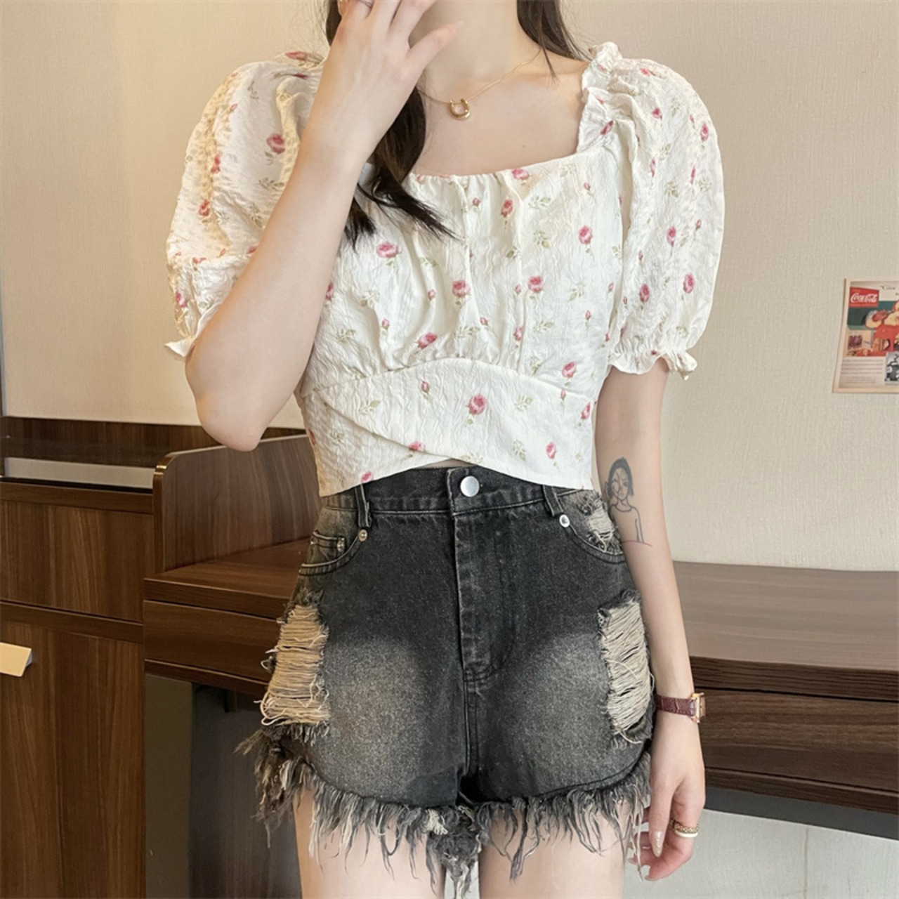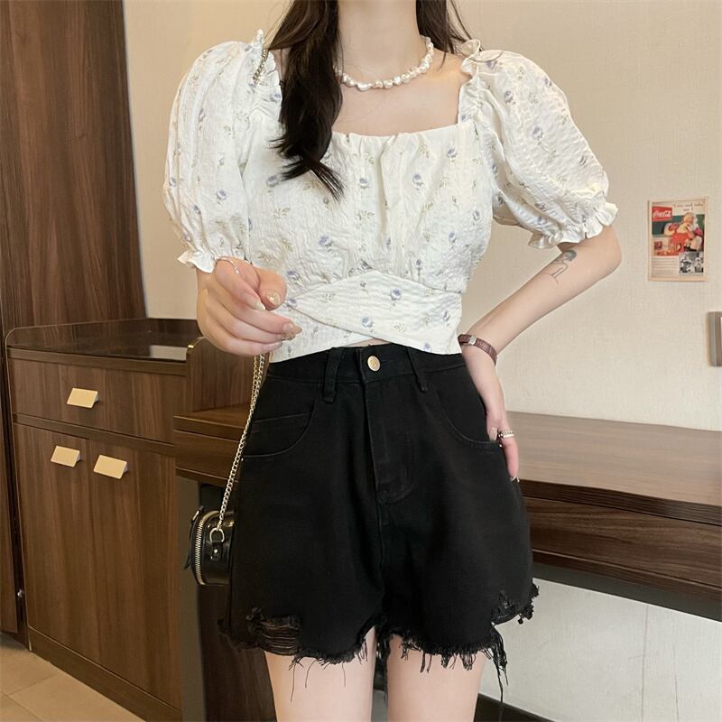 華やかな花柄プリントと女性らしいパフスリーブが特徴のショート丈シャツです。背中のリボンがアクセントになって、後ろ姿も可愛らしく演出してくれます。