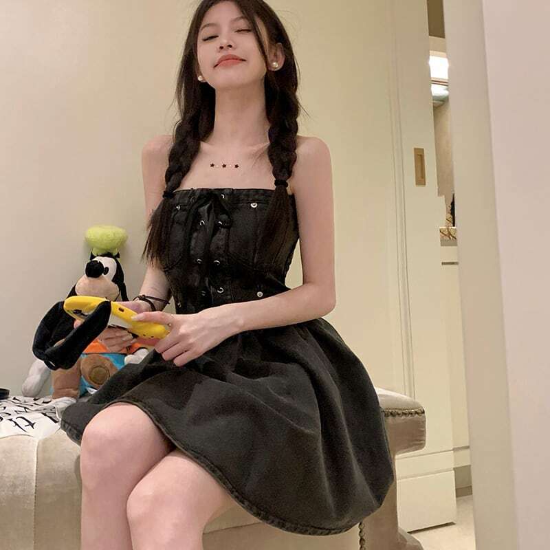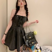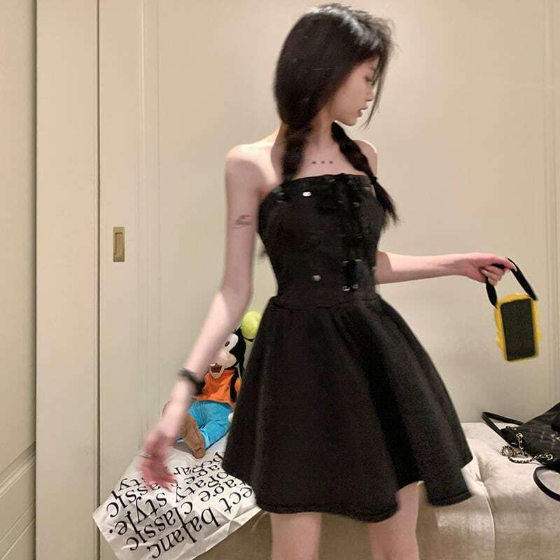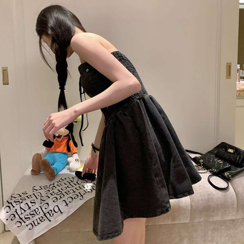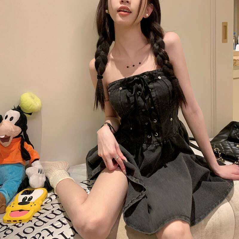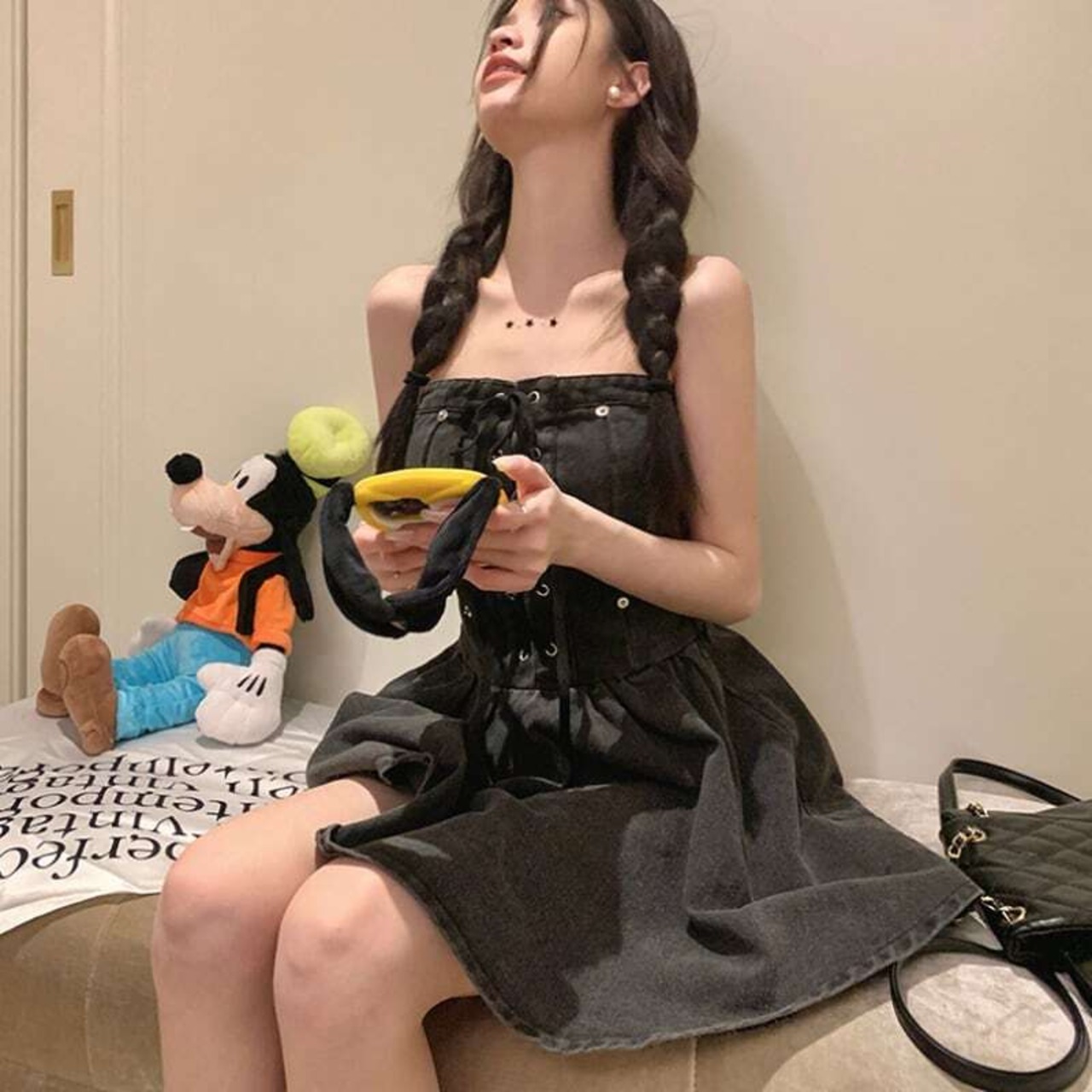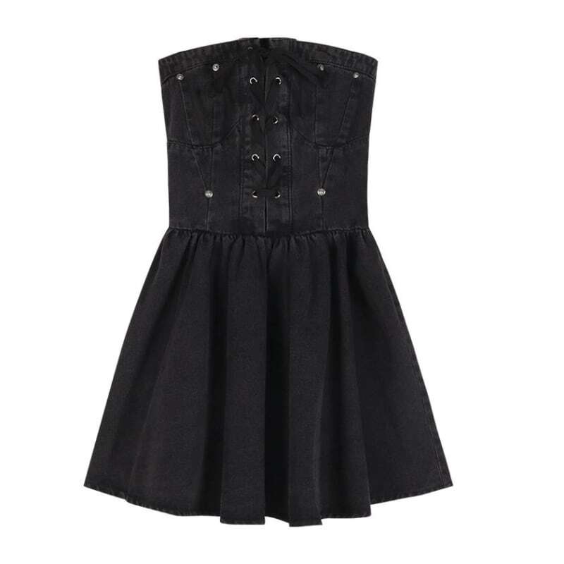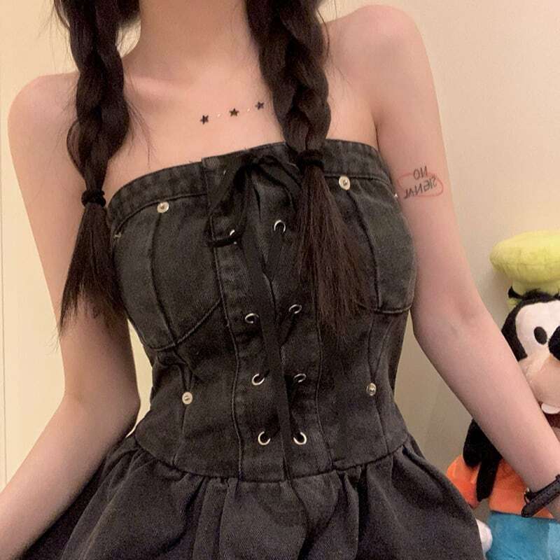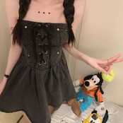 レースアップ ノースリーブ チューブトップ コルセット風 デニム ミニワンピース
