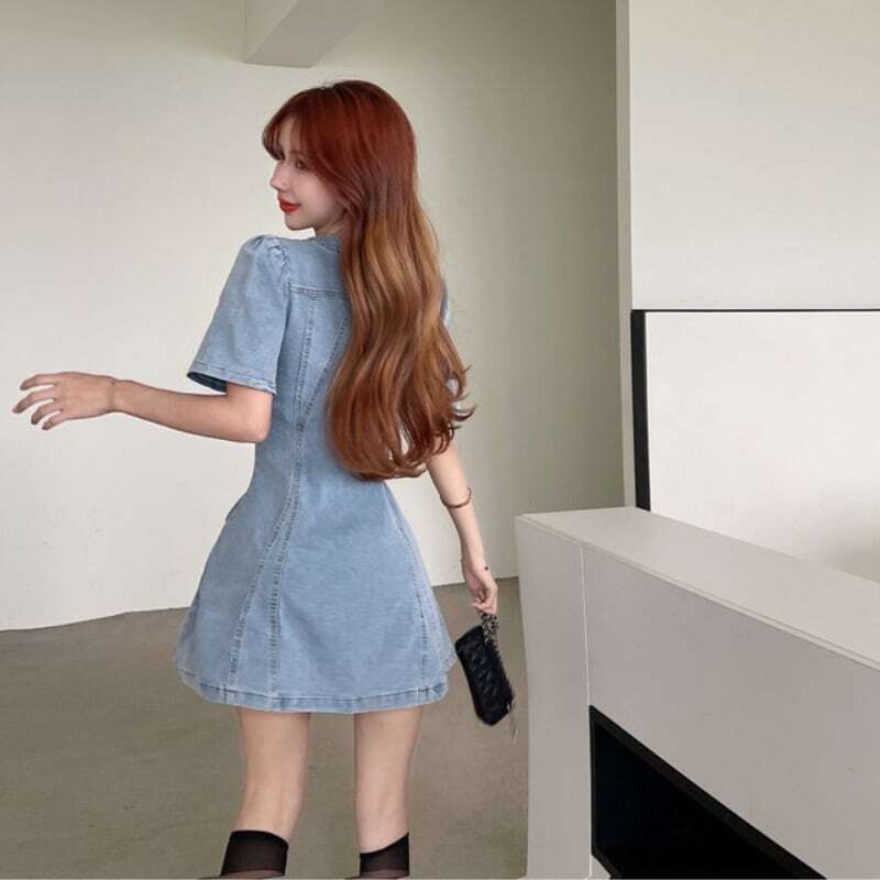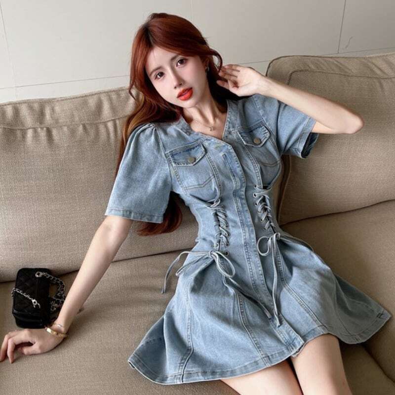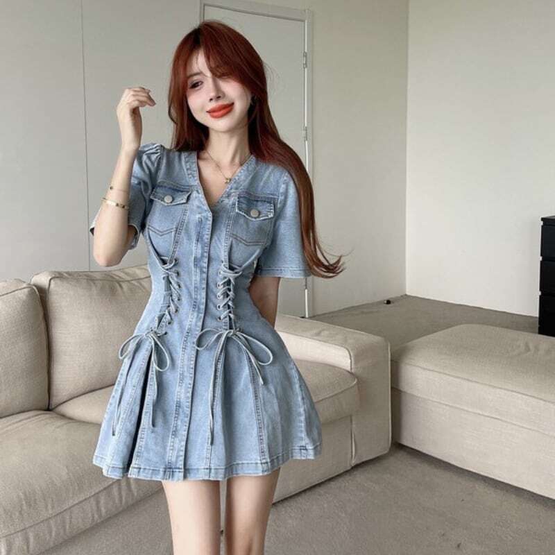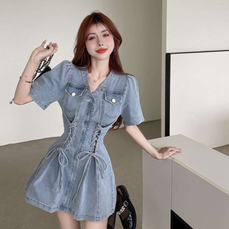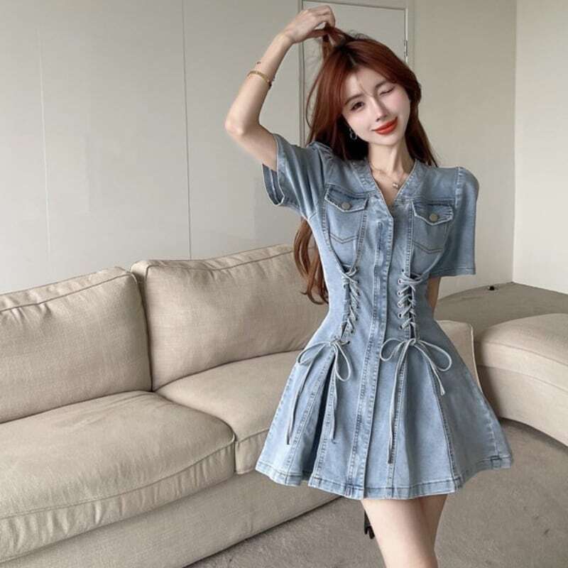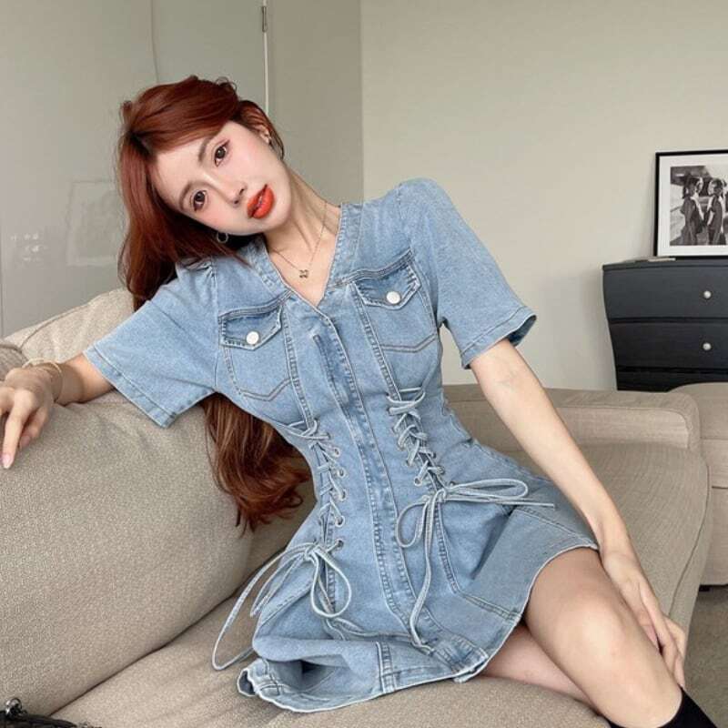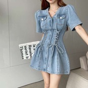 Vネック レースアップ ヴィンテージ デニム ミニワンピース