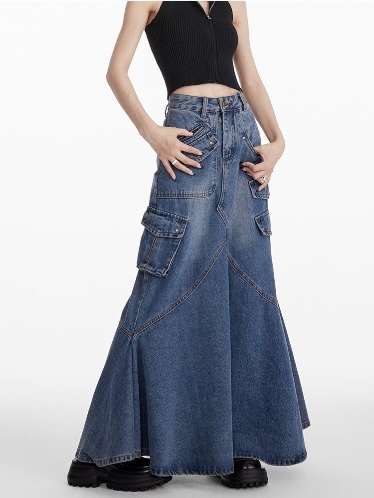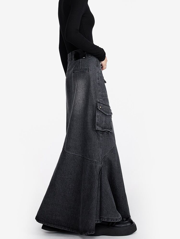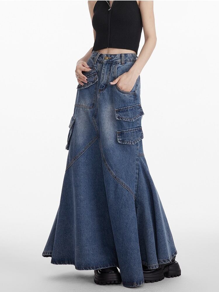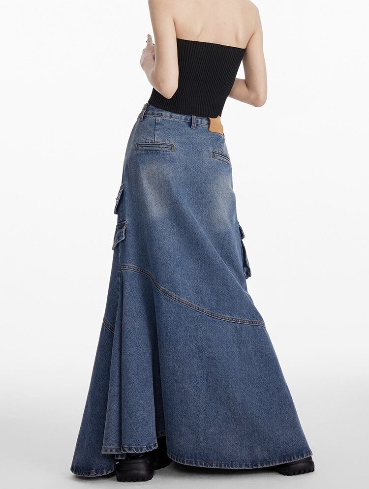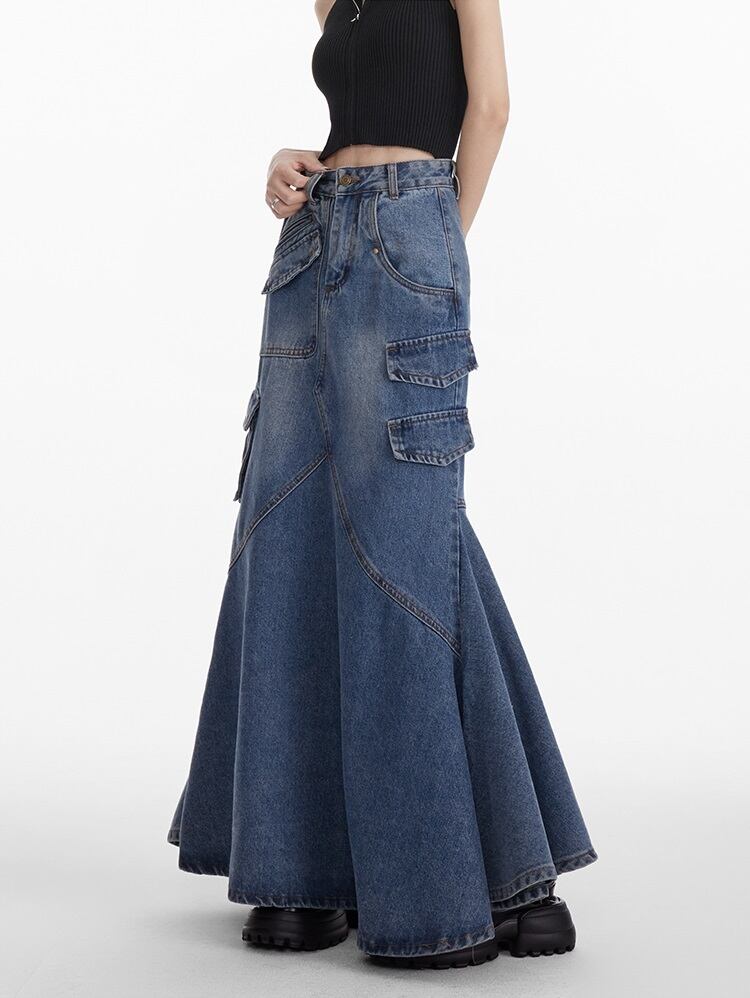 デニム ロングスカート フリルデザイン レディース フィッシュテール 韓国