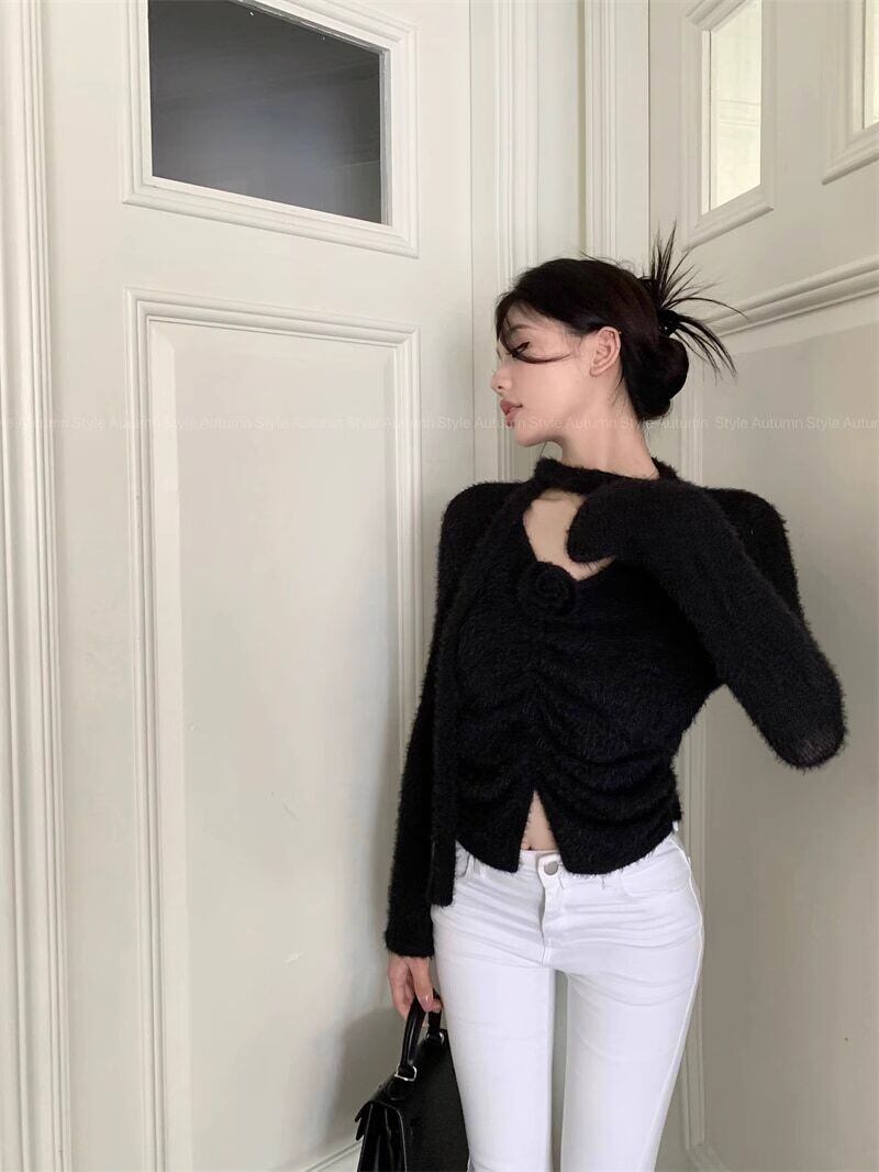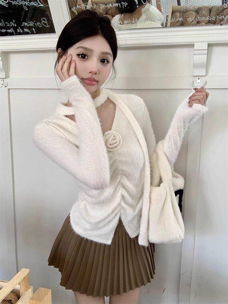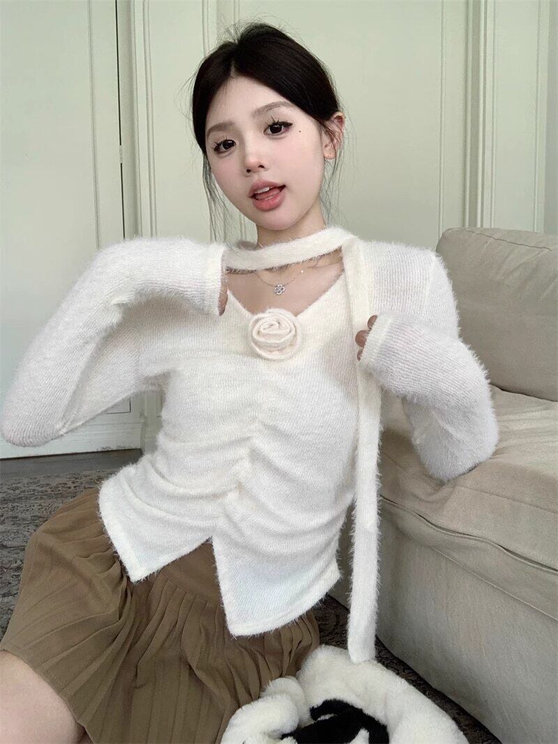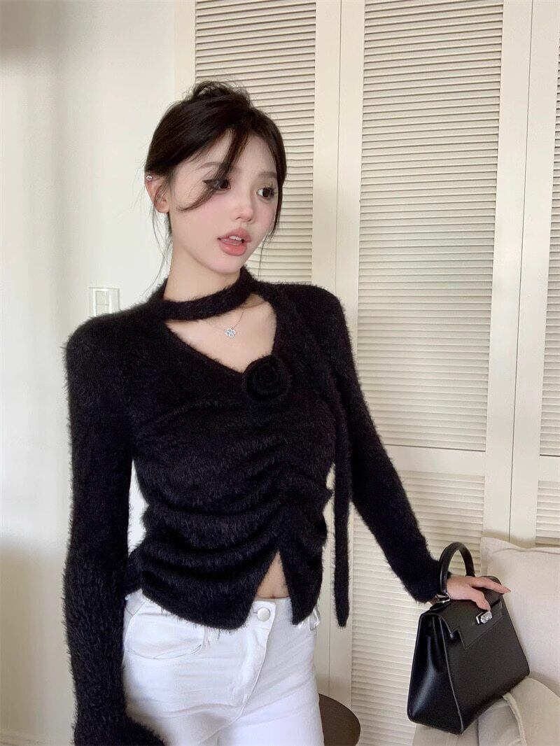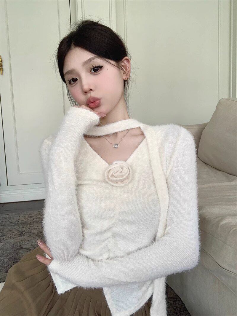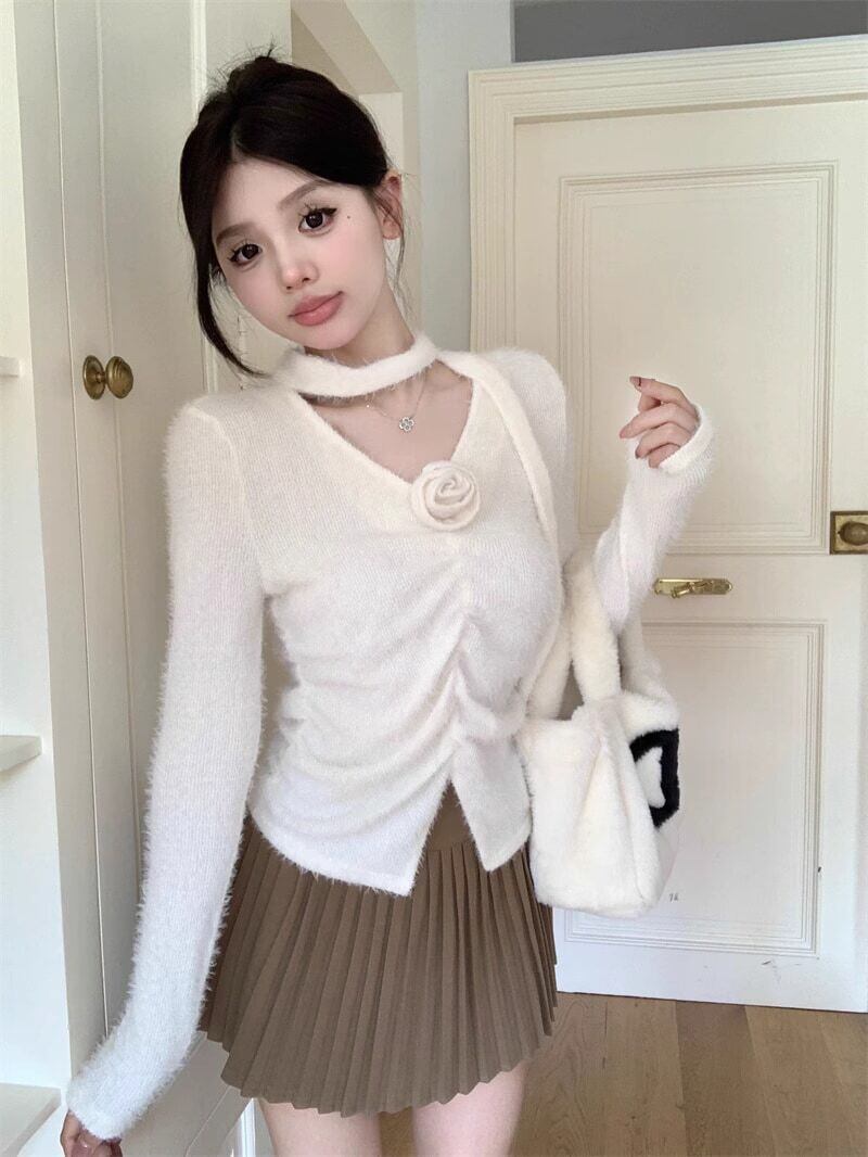 Vネック フロントフラワー ニット カジュアル 韓国 セーター かわいい おしゃれ