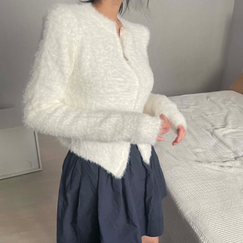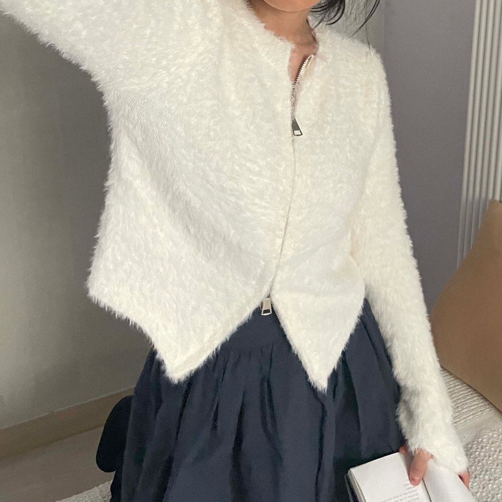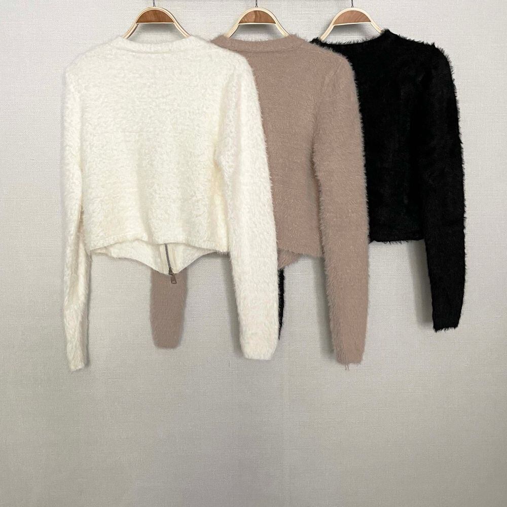 シャギーニット フロントジッパー 大人カジュアル 韓国 指穴 大人可愛い