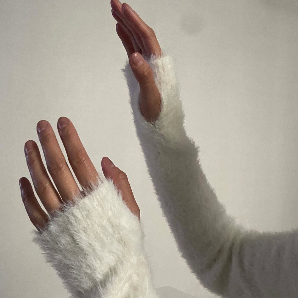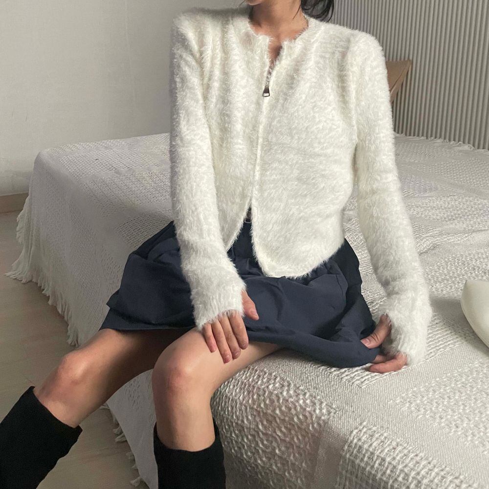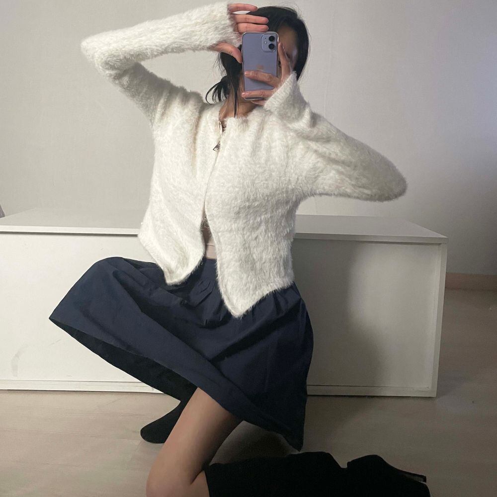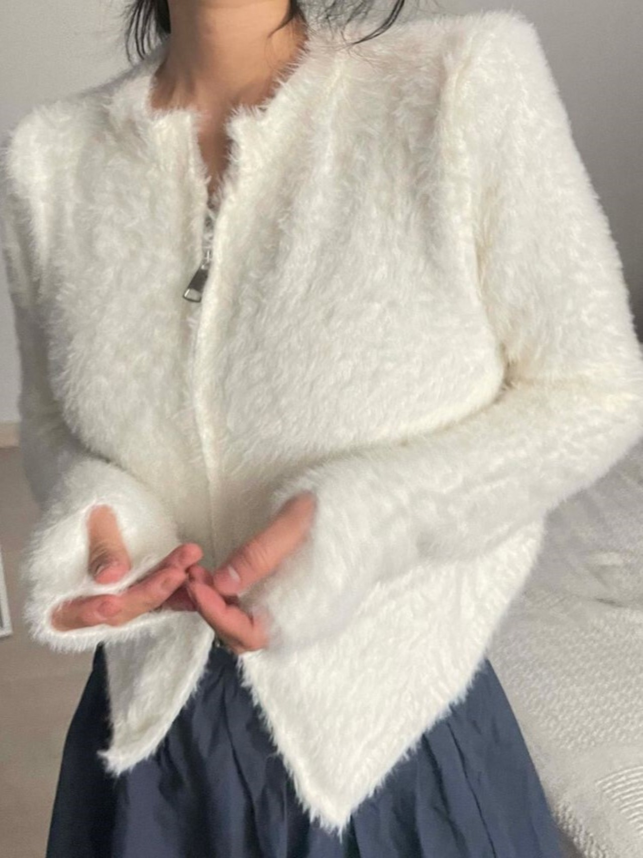 シャギーニット フロントジッパー 大人カジュアル 韓国 指穴 大人可愛い