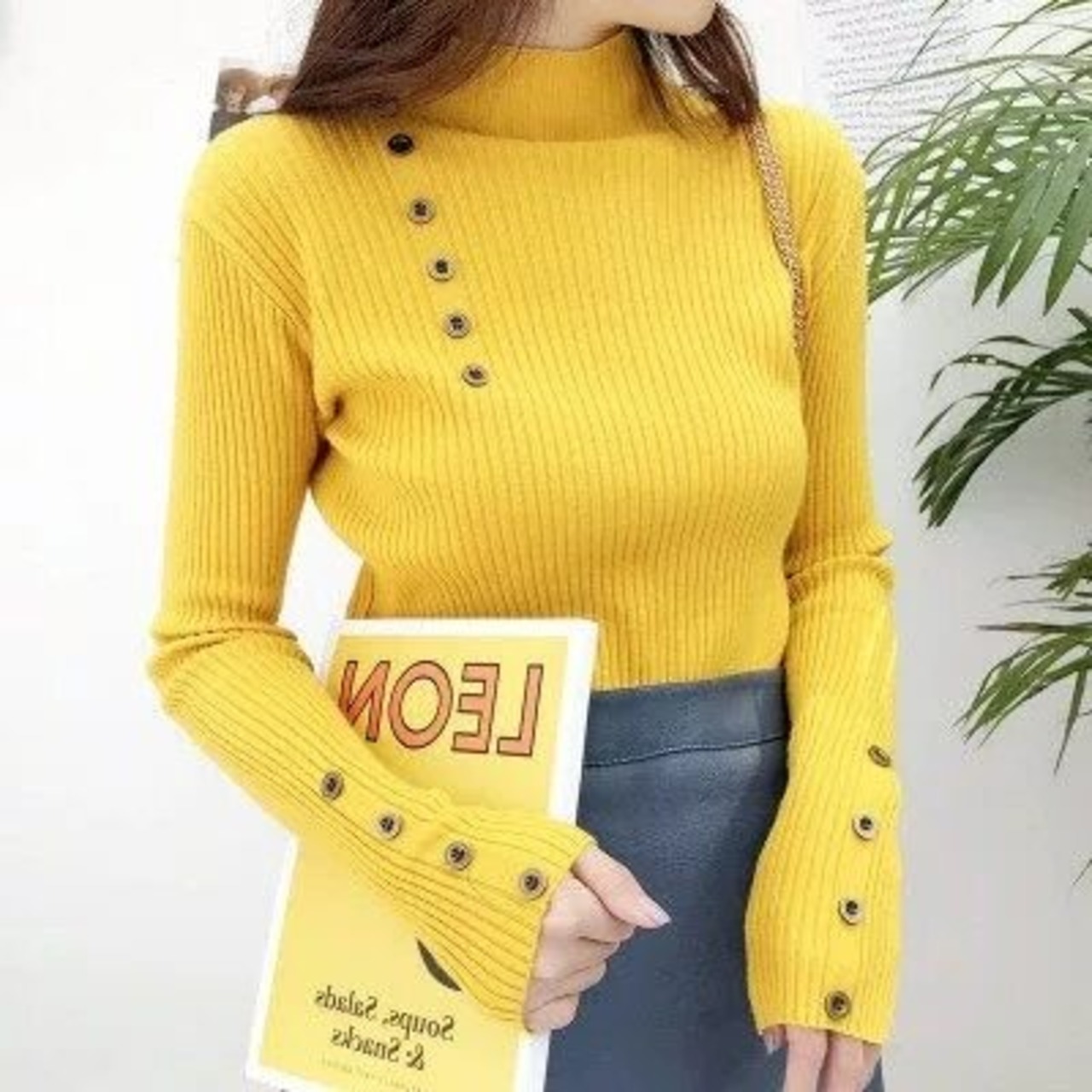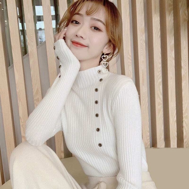 リブニットアシンメトリーボタン【低身長さんにも】
